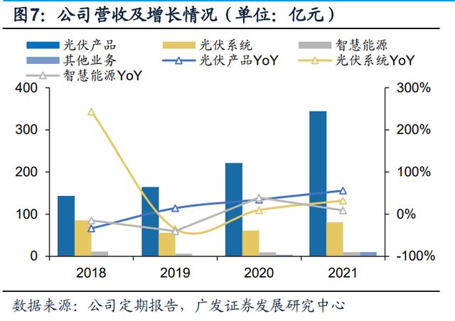 光伏组件奠定业绩基石,分布式系统突飞猛进,业绩保持高速增长。2021年公司实现营收444.8亿元,同比+51.2%;实现归母净利润18.0亿元,同比+46.8%,其中组件业务营收343.95亿元,同比+55.97%,占比77.3%;光伏系统营收80.58亿元,同比+32.17%,占比18.1%,其中电站EPC业务占比7.85%,系统产品业务占比 10.26%;智慧能源业务营收10.00亿元,同比+8.96%,营收占比2.25%,其中发电业务与运维占比1.89%,智能微网及多能系统占比0.36%;2021年组件业务毛利润 42.74亿元,同比+30.1%,占比67.96%,光伏系统毛利润11.91亿元,同比+45.23%,占比18.93%,智慧能源毛利润5.30亿元,同比-4.84%,占比8.43%。公司业绩同比增速大幅提升,主要系组件出货量增长、市场结构优化及期间费用优化所致。