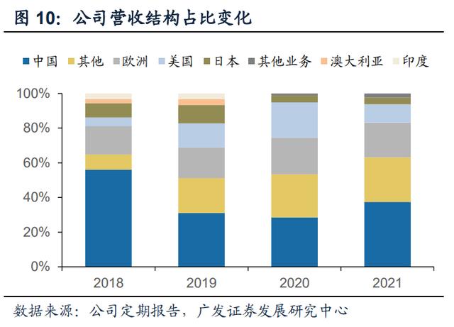 光伏组件出货快速提升,分布式及海外占比提升推动结构优化。根据PVInfoLink,2021年公司组件出货量全球排名第二,实现销量24.8GW,同比增长 55.83%,其中公司深耕210mm尺寸“至尊”组件产品系列,210大尺寸组件出货量全球第一。同时,光伏分布式系统产品业务稳步推进,依托“天合富家”、“天合蓝天”双品牌,已连续三年实现出货量翻番,2021年出货量超2GW。公司深耕海外分布式市场,在欧洲、澳洲和印度等地实现单点突破,充分发挥全球品牌渠道优势,海外地区营收占比2019年以来稳定在60%-70%,有望通过提升海外占比推动盈利结构优化。