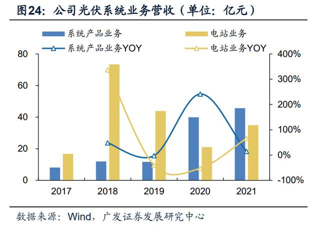 乘分布式之风,系统产品业务铸造业绩新引擎。受国内整县推进政策与分布式补贴激励,叠加欧洲天然气价格飙升,全球分布式光伏迎来快速增长,2022Q1国内光伏新增装机13.21GW,其中分布式占比近70%,组件出口41.30GW,同比+108.5%。 2017-2021年,公司系统产品业务营收从8.08亿元提升至45.64亿元,CAGR达54%, 2021年光伏系统出货量超2GW,连续三年翻番,预计22年出货量达5GW。电站业务营收从2017年的16.78亿元上升至2021年的34.94亿元,实现翻倍增长,国内电站系统业务超预期达成目标,斩获近3.5GW+光伏电站指标,同比增长超200%,海外电站系统业务在海外多个国家实现单点突破,多个项目并网、投入正式运营中。