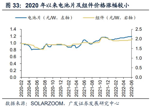 组件环节,由于TOPCon组件封装方案并未发生较大改变,仅要求使用阻水性更好的光伏胶膜,因此我们假设POE胶膜较EVA胶膜均价提升2元/平,其他辅材使用量及价值量不变,测算得到,当TOPCon组件输出功率高出PERC组件25W时,其非硅成本较PERC降低约0.019元/W。综上,我们认为N型TOPCon电池降本提效路径清晰,将继续通过提高电池转换效率及良率,推动硅片薄片化、减低银浆成本及设备初始投入等方式,实现一体化成本逐步与PERC成本打平。