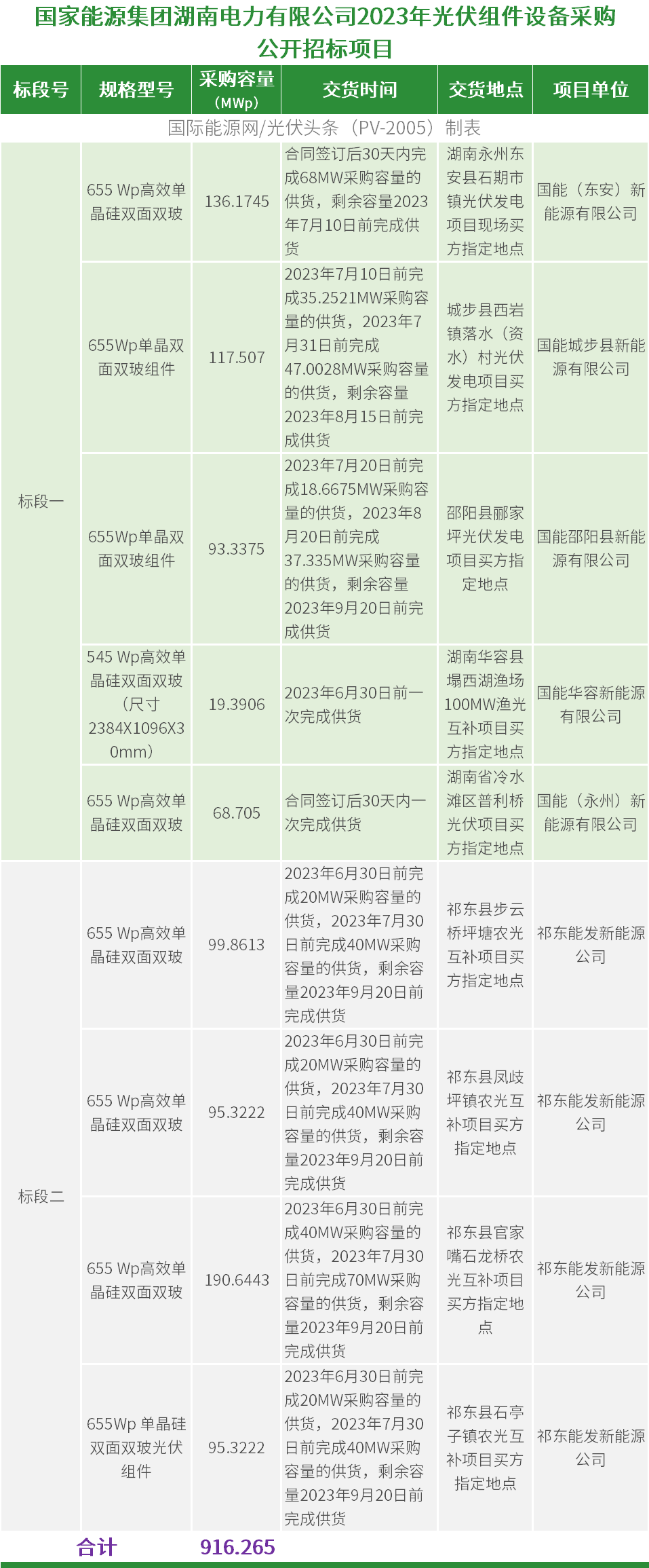 根据招标公告,国家能源集团湖南电力有限公司2023年光伏组件设备采购公开招标项目包括2个标段,规模共计916.265MW。