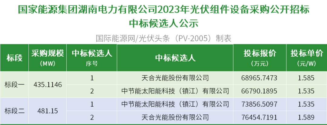 标段一第一中标候选人为天合光能股份有限公司,投标报价为68965.7473万元,投标单价为1.585元/W;第二中标候选人为中节能太阳能科技(镇江)有限公司,投标报价为66790.1895万元,投标单价为1.535/W。