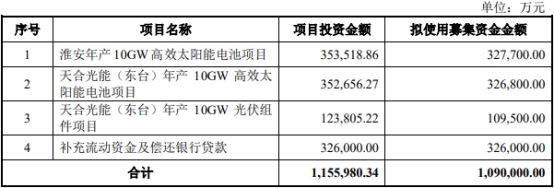 2023年6月30日晚间,天合光能发布2023年度向特定对象发行A股股票预案。本次向特定对象发行股票募集资金总额不超过1,090,000.00万元(含本数),募集资金扣除相关发行费用后将用于投资淮安年产10GW高效太阳能电池项目、天合光能(东台)年产10GW高效太阳能电池项目、天合光能(东台)年产10GW光伏组件项目、补充流动资金及偿还银行贷款。