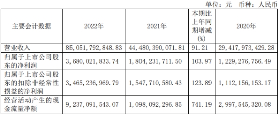 2022年,天合光能实现营业收入850.52亿元,同比增长91.21%;实现归属于上市公司股东的净利润36.80亿元,同比增长103.97%;实现归属于上市公司股东的扣除非经常性损益的净利润34.65亿元,同比增长123.89%;经营活动产生的现金流量净额为92.37亿元,同比增长741.19%。