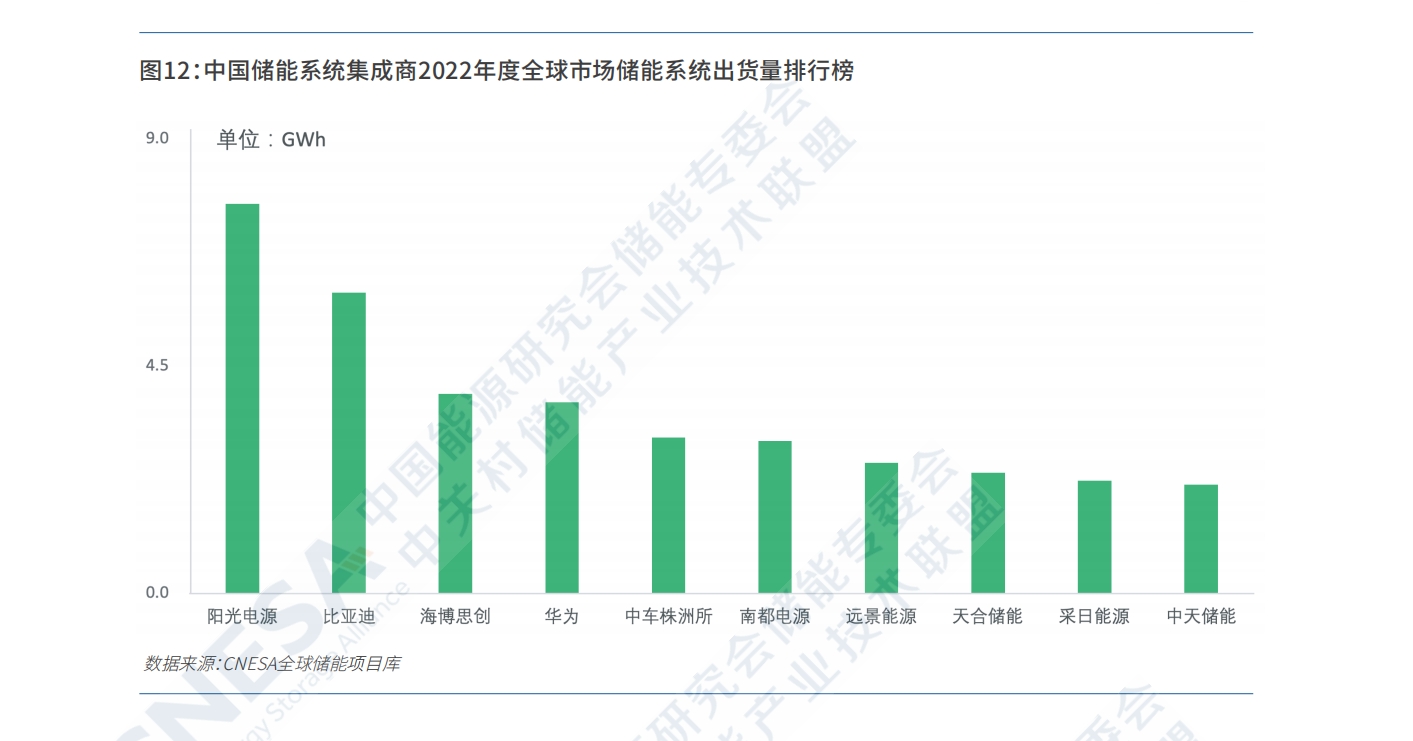 2022年中国储能系统集成商全球市场储能系统出货量排行榜