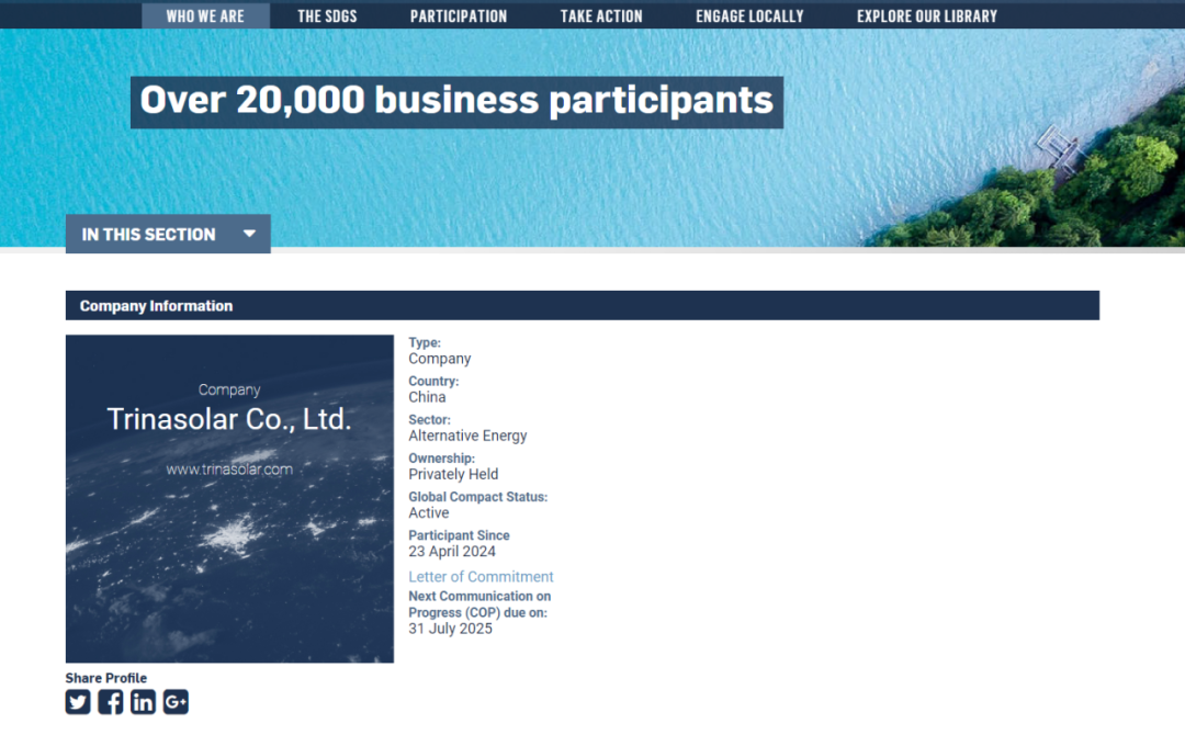 联合国全球契约(UNGC)是世界上最大的推进企业可持续发展的国际组织,作为参与企业,天合光能将有机会参与“可持续发展(SDG)全球商业论坛”,“联合国全球契约领导人峰会”等活动,天合光能不仅能够与拥有共同愿景的企业进行深度合作,还能通过行业指导、全球案例实践、技术创新等成果树立标杆,履行对人类和地球的基本责任。