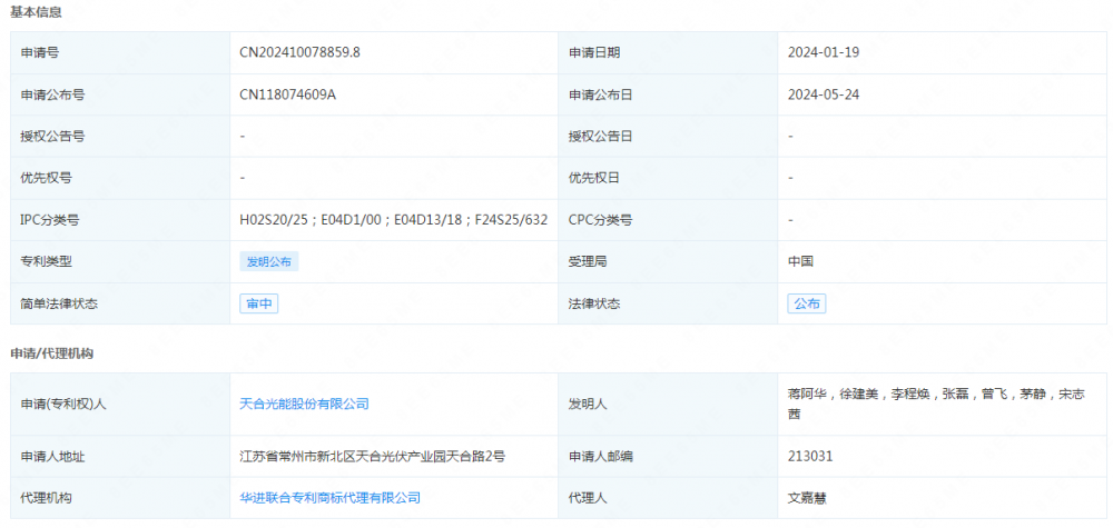 天合光能申请一项专利名为“光伏瓦片收边安装结构”,公开号CN118074609A,申请公布日期为2024年5月24日。