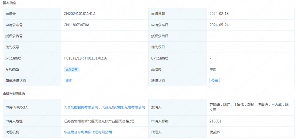 天合光能申请一项专利名为“TOPcon太阳电池及其制备方法”,公开号CN118073470A,申请公布日期为2024年5月24日。