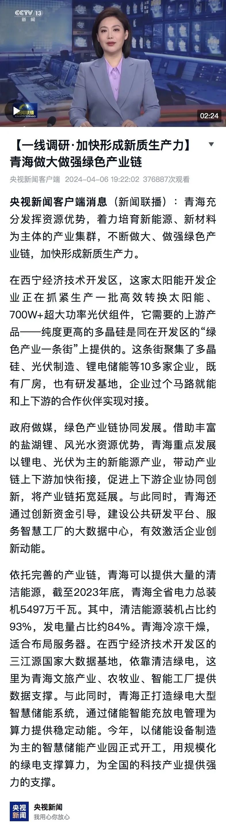 4月6日,央视《新闻联播》推出“一线调研·加快形成新质生产力”栏目,播出《青海做大做强绿色产业链》。