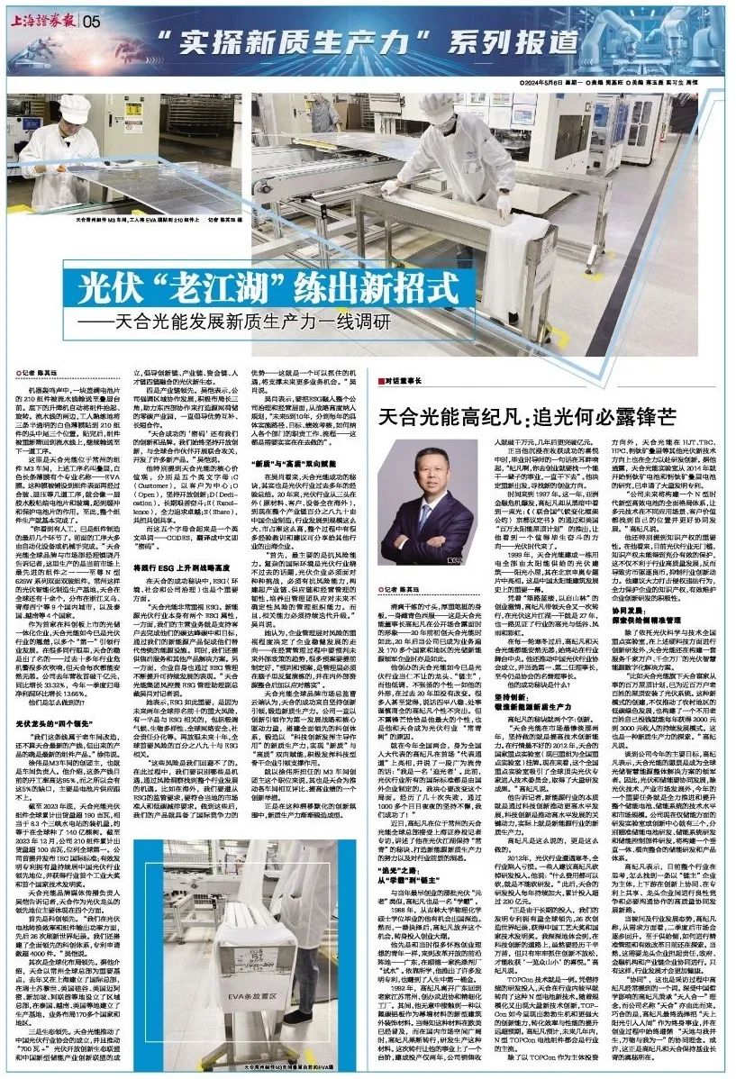 5月6日,上海证券报刊发《实探新质生产力|光伏“老江湖”练出新招式——天合光能发展新质生产力一线调研》。