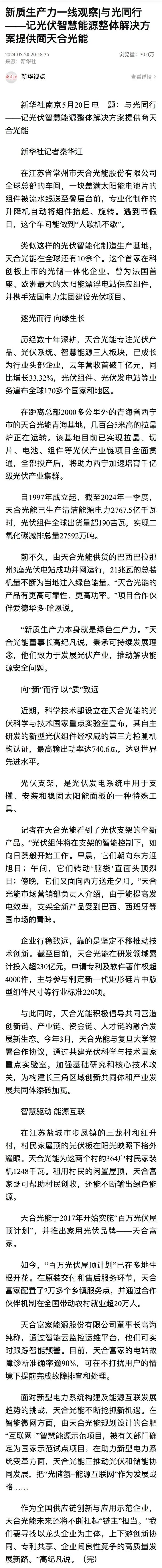 2024年5月20日,新华社刊发《新质生产力一线观察|与光同行——记光伏智慧能源整体解决方案提供商天合光能》。
