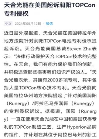 此外,力场君还关注到曾有一篇报道《天合光能在美国起诉润阳TPOCon专利侵权》,其中提到天合光能向美国特拉华州地方法院提起针对美国润阳、阿拉巴马州润阳的专利侵权诉讼,并有报道提及“润阳一直在使用天合光能在中国和泰国获得专利的TPOCon制造工艺。”