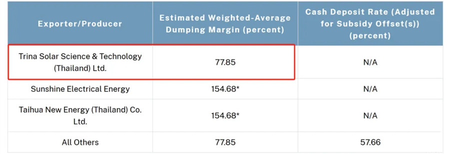 此前,当地时间11月29日,美国商务部公布了其对柬埔寨、马来西亚、泰国和越南4个国家光伏电池产品反倾销税调查的初步肯定性裁定,四国反倾销税率范围在0—271.28%。其中,天合光能泰国工厂被裁定的初步倾销税率为77.85%。