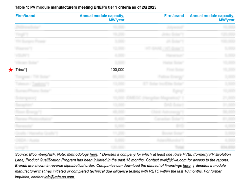 近日,全球权威新能源研究机构彭博新能源财经(BloombergNEF,简称BNEF)公布了2025年第二季度Tier 1光伏组件制造商榜单,本季度榜单相比于之前在评审标准上进一步升级,更加严苛。天合光能凭借优异的可融资能力、领先的技术实力以及210至尊系列产品强劲的出货量再次稳居Tier 1榜单,充分彰显了其作为全球光储智慧能源解决方案引领者的硬核实力与全球市场的高度认可。