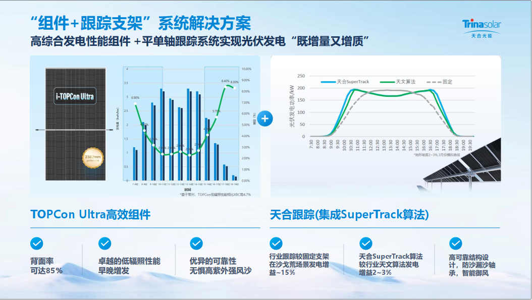 光伏市场化时代,发电曲线与用电需求的精准匹配,决定了每一度电的价值。依托高双面率及优异的低辐照性能,TOPCon组件在早晚时段的高发电能力能够实现客户价值更大化。此外,光储协同背景下, 天合光能 可为客户提供全套的高价值光储融合解决方案:TOPCon组件的高发电能力匹配跟踪支架的SuperTrack算法,同时辅以储能独有的AI动态调节,实现光伏发电“既增量又增质”。