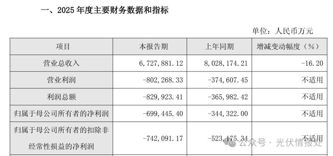 报告期内,光伏行业仍面临阶段性供需失衡,产业链各环节开工率处于低位,市场竞争进一步加剧,叠加国际贸易保护政策持续影响,上半年光伏产品价格较去年同期普遍承压;尽管下半年光伏产品价格在行业反内卷工作推进下逐步提升,然而受硅料、银浆等关键原材料成本快速上涨的影响,公司组件业务全年盈利能力较上年同期有所下滑,2025 年度公司经营业绩仍然亏损。同时基于谨慎性原则,公司对出现减值迹象的长期资产进行减值测试,经过审慎评估将按照业会计准则计提资产减值准备,对业绩有一定影响。报告期内,公司积极把握储能行业发展机遇,公司加速推动储能业务和系统解决方案业务转型发展,持续加大研发创新投入,加速拓展全球营销网络布局。依托成熟的全球化系统解决方案能力和高效交付服务体系,公司储能业务海外市场出货量实现快速增长,市场份额显著提升。