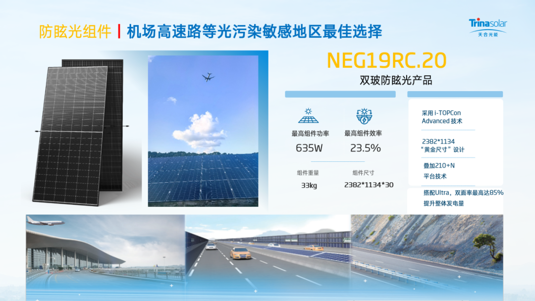 防眩光组件 则聚焦机场、高速路等光污染敏感场景,打造 “高发电+无眩光” 的双重优势,在保证高功率、高效率发电的同时,防眩范围扩大2倍,眩光强度直降47%,从源头解决眩光问题,适配机场、高速路等对光污染有严格要求的特殊场景,让敏感场景的光伏布局既合规又高效。
