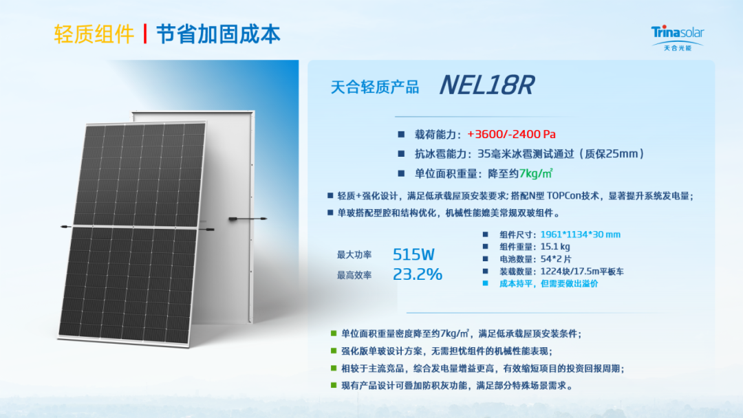 轻质组件 则精准解决低载荷屋面的加固难题,成为低承载屋面分布式项目的“专属选择”,实现了轻量化与高性能的完美平衡,单位面积重量降至约 7kg/m2,组件整体重量小于16kg,却拥有+ 3600/-2400 Pa 的高载荷能力,还通过 35 毫米冰雹测试,搭配型腔和结构优化设计,让其机械性能媲美常规双玻组件。在无需额外增加屋面加固成本的前提下,有效缩短项目投资回报周期,让低载荷屋面也能高效布局光伏项目。