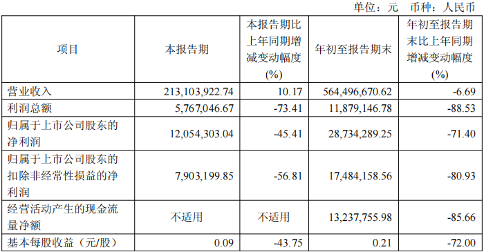 从年初至报告期末(2025年1-9月),公司累计营业收入5.64亿元,同比下降6.69%;累计归属于上市公司股东的净利润2873.43万元,同比下降71.40%;累计归属于上市公司股东的扣除非经常性损益的净利润1748.42万元,同比下降80.93%;基本每股收益0.21元/股,同比下降72.00%;加权平均净资产收益率2.28%,较上年同期减少5.6个百分点,全年业绩受外部环境与内部投入双重影响短期承压。