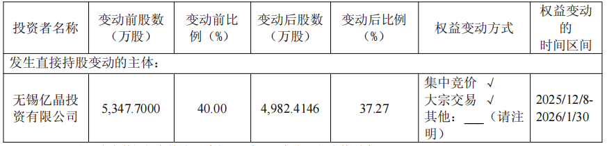 本次权益变动后,亿晶投资持股公司股份数量由53,477,000股减少至49,824,146股,持有公司股份比例由40.00%减少至37.27%,权益变动触及1%刻度。