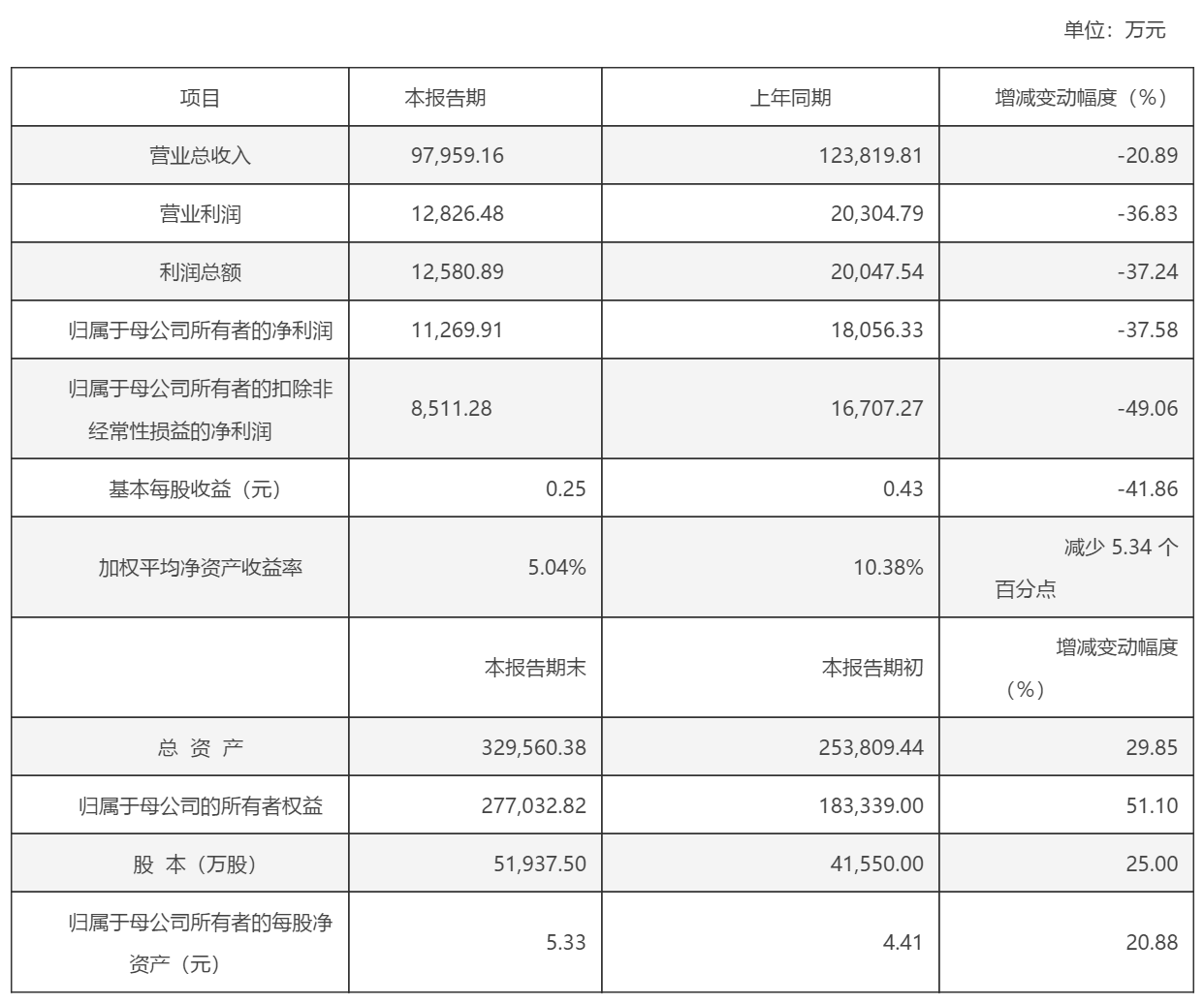 此外,报告期末公司总资产329,560.38万元,较期初增长29.85%;归属于母公司的所有者权益277,032.82万元,较期初增加51.1%。