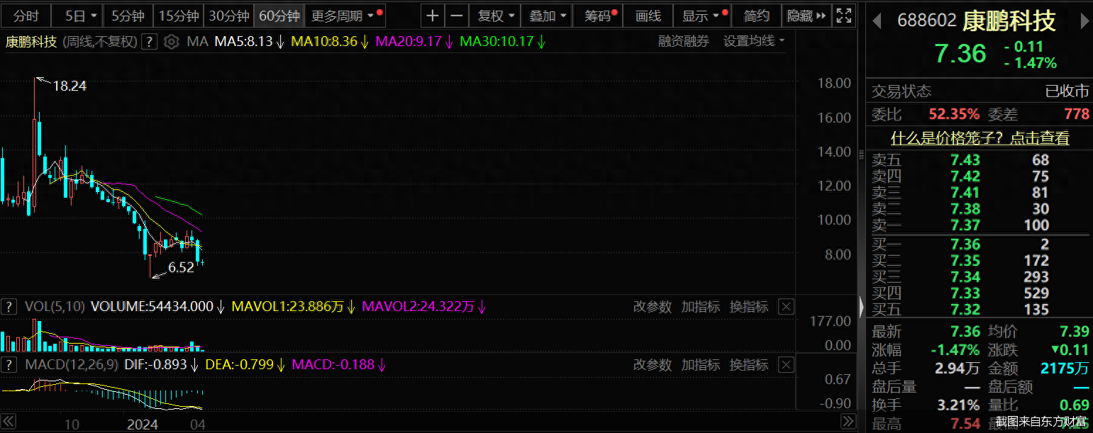 从2023年9月1日之后,康鹏科技股价开始震荡走低,在今年1月24日盘中公司股价最低达到8.76元/股,出现破发。1月24日之后,康鹏科技股价仍继续下挫,在2月8日盘中达到6.52元/股的低点,也是公司上市后股价新低,截至4月23日收盘,康鹏科技股价有所回调,报7.36元/股,但仍处于破发状态,最新总市值38.23亿元。