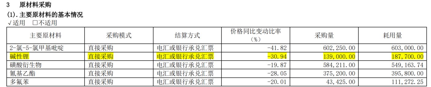 钛媒体APP留意到,2023年公司对LiFSI产品的主要原料碱性锂的采购量是低于当年耗用量的,这也意味着尽管价格不理想,公司选择减少库存积压亏本销售,如果2022年末的库存不算多,那么按理说公司高价原料库存或已经接近消耗完毕。