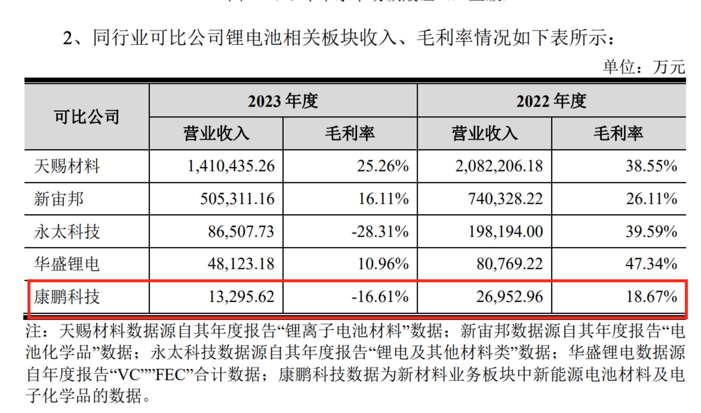 尽管如此,从行业多家同类型公司横向比较来看,康鹏科技显然受到的冲击较大。与四家可比上市公司相比,公司新能源电池材料及电子化学品营收下滑幅度约5成,排名第二。此外,公司亦是毛利率为负的两家企业之一。