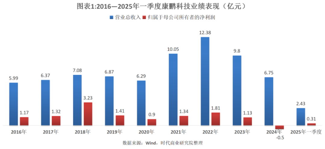 Wind数据显示,在康鹏科技上市前一年,即2022年,该公司的营收达到12.38亿元,创下自2016年以来的最高水平。而2023—2024年,该公司的营收分别为9.80亿元、6.75亿元,同比变动率分别为-20.89%、-31.11%。