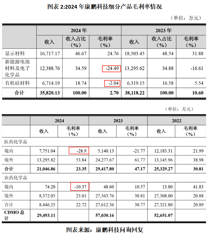 自2023年上市以来,康鹏科技业绩持续下滑,2024年净利润甚至由盈转亏。今年6月14日,康鹏科技披露的《关于2024年年度报告的信息披露监管问询函的回复公告》(下称“问询回复”)显示,受到行业竞争加剧及境内销售的CDMO产品技术门槛较低等因素影响,该公司负毛利率产品收入占比达到四成;而对境外销售毛利率虽然维持在较高水平,但是收入同比大幅下降,也给其盈利能力带来冲击。