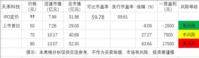 结论:天承科技(代码:688603)IPO上市估值较高,性价比较低,有一定概率破发风险,建议谨慎申购,我选择申购。