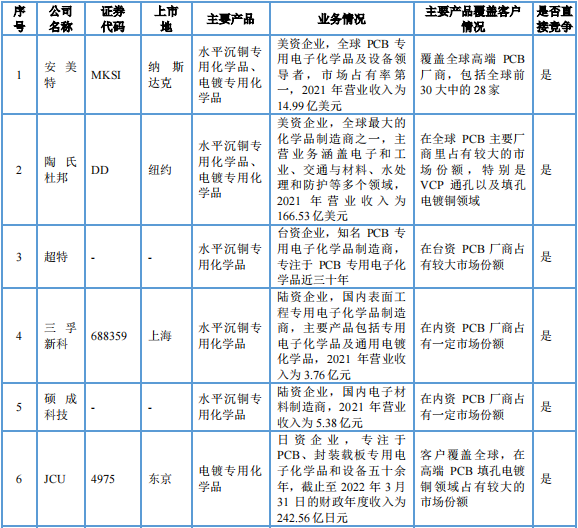公司产品主要为 PCB 专用电子化学品,主要产品介绍及应用情况如下: