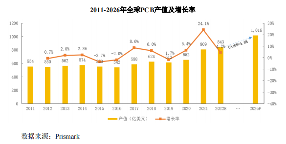 PCB 专用电子化学品系 PCB 生产制作中的必备原材料,PCB 的生产制造过程中的化学沉铜、电镀、铜面表面处理等众多关键工序均需要使用大量 PCB 专用电子化学品。据 Prismark 统计,2021 年全球 PCB 产值达到 809.20 亿美元较 2020 年增长 24.1%。在未来五年,PCB 行业主要受到云计算、物联网、5G通信、工业 4.0 等行业的拉动,据 Prismark 预测,2022 年全球 PCB 产业总产值将增长 4.2%:未来五年全球 PCB 市场将保持温和增长,2021 年至 2026 年复合年均增长率为 4.6%。