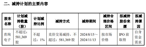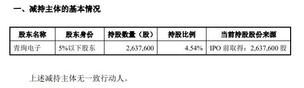 截至公告披露日,股东青珣电子直接持有公司股份2,637,600股,占公司总股本比例为4.54%,其中977,105股股份已于2024年7月10日解禁。