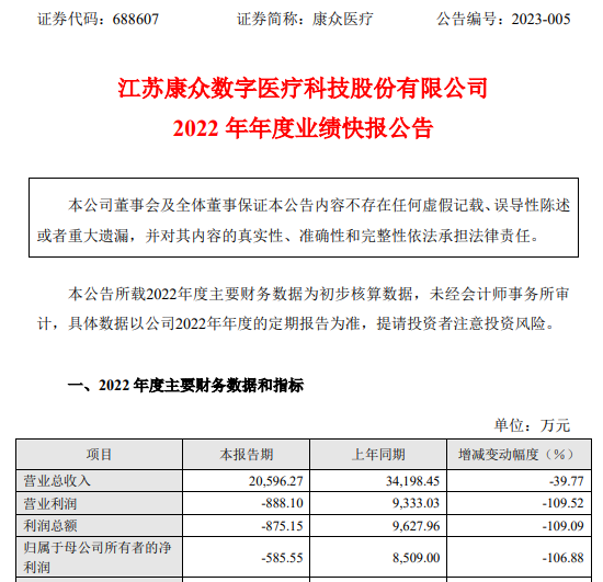 挖贝网2月28日,康众医疗(688607)发布2022年度业绩快报,公告显示,2022年度营业总收入为20,596.27万元,比上年同期下滑39.77%;归属于母公司股东的净利润为-585.55万元,较上年同期由盈转亏。