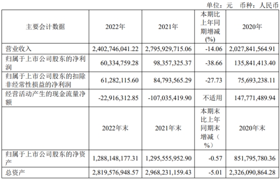 九联科技2022年年度报告显示,公司2022年营业收入为24.03亿元,同比下降14.06%;归属于上市公司股东的净利润为6033.48万元,同比下降38.66%;归属于上市公司股东的扣除非经常性损益的净利润为6128.21万元,同比下降27.73%;经营活动产生的现金流量净额为-2291.63万元,上年同期为-1.07亿元。