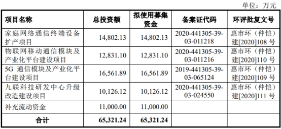 九联科技首次公开发行的募集资金总额为3.99亿元,募集资金净额为3.45亿元;公司2021年3月17日披露的招股书显示,公司拟募集资金65,321.24万元,计划用于家庭网络通信终端设备扩产项目、物联网移动通信模块及产业化平台建设项目、5G通信模块及产业化平台建设项目、九联科技研发中心升级改造建设项目、补充流动资金。