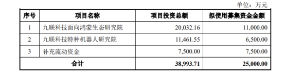 九联科技于2023年7月18日披露2023年度以简易程序向特定对象发行股票的预案,公司本次发行募集资金总额不超过25,000.00万元(含本数),不超过人民币三亿元且不超过最近一年末净资产百分之二十;在扣除相关发行费用后的募集资金净额拟投资于九联科技面向鸿蒙生态研究院、九联科技特种机器人研究院、补充流动资金。