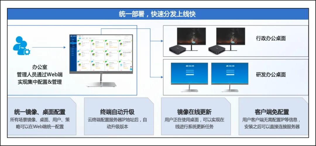 通过锐捷统一管理平台,IT团队可对全公司数百台云桌面进行批量部署、远程维护、策略下发与故障排查。