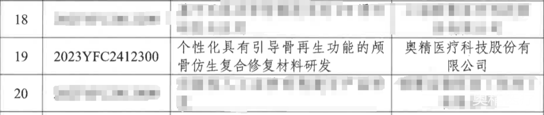 2023年,科技部生物技术发展中心发起了国家重点研发计划专项“诊疗装备与生物医用材料”,其中,指南方向“个性化具有引导骨再生功能的颅骨仿生复合修复材料研发(共性关键技术类)”与奥精医疗科技股份有限公司(以下简称“奥精医疗”)的研究基础高度契合,奥精医疗联合9家国内上下游优势单位进行项目申报,经过充分准备,激烈角逐,项目获得批准。并于2023年11月收到由中国生物技术发展中心发布的科技部文件《关于国家重点研发计划“诊疗装备与生物医用材料”重点专项 2023 年度项目安排公示的通知》。