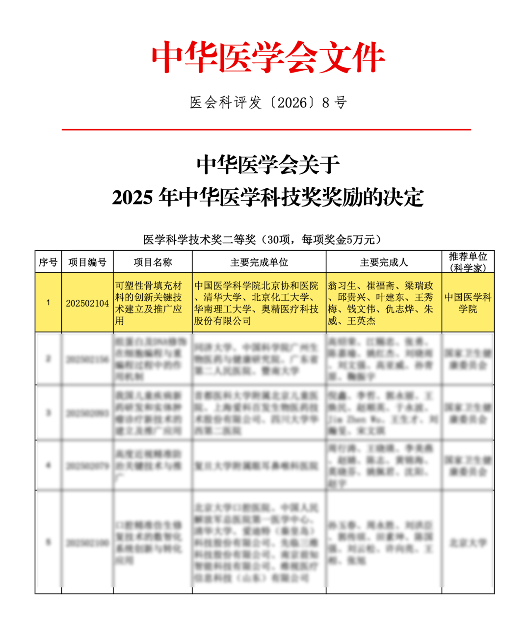 其中,由中国医学科学院北京协和医院、清华大学、北京化工大学、华南理工大学联合奥精医疗科技股份有限公司共同完成的项目——《可塑性骨填充材料的创新关键技术建立及推广应用》,荣获 2025 年中华医学科技奖·医学科学技术奖二等奖。