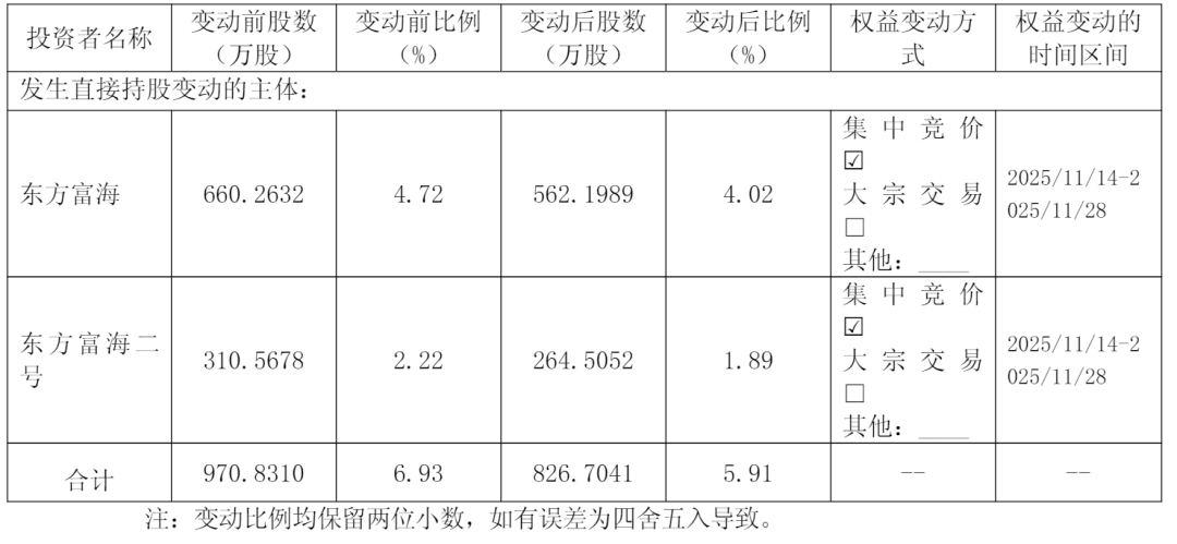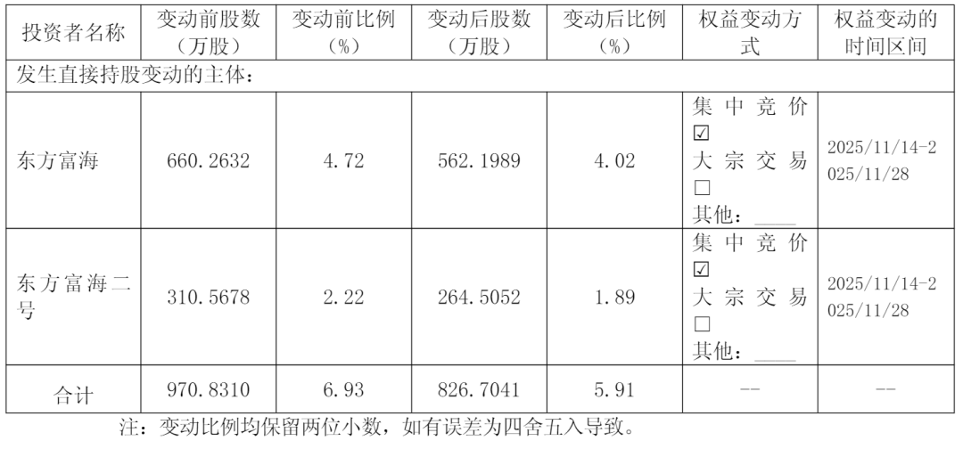 2025年11月14日至2025年11月28日,东方富海及东方富海二号通过集中竞价方式合计减持1,441,269股,所持有公司股份数量由9,708,310股减少至8,267,041股,占公司总股本的比例由6.93%减少至5.91%,减持了1.02个百分点。