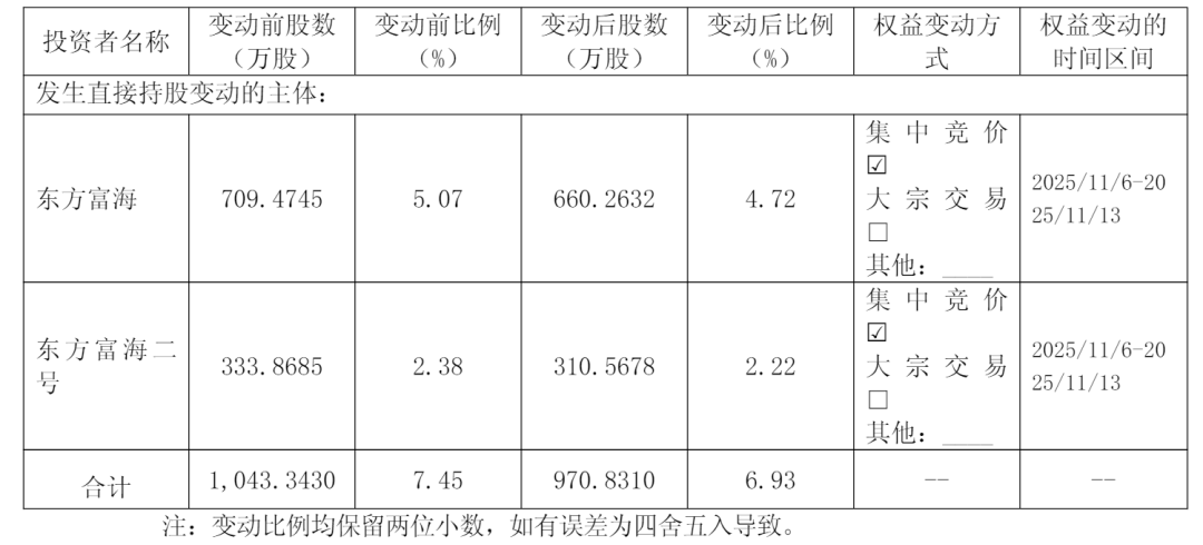 其中,2025年11月6日至2025年11月13日,东方富海及东方富海二号通过集中竞价方式合计减持公司股份725,120股,所持有公司股份数量由10,433,430股减少至9,708,310股,占公司总股本的比例由7.45%减少至6.93%,减持了0.52个百分点。