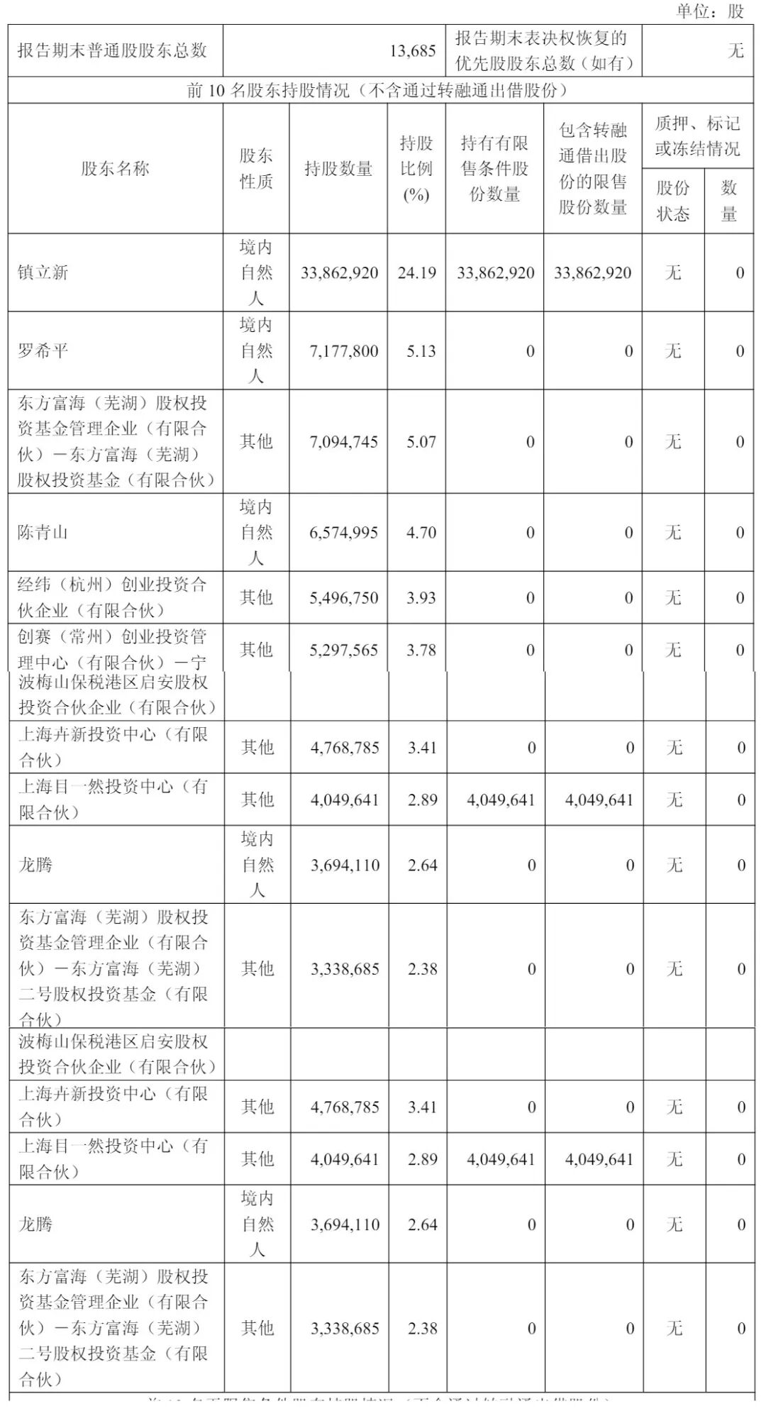 上海卉新投资中心(有限合伙)持股为3.41%,上海目一然投资中心(有限合伙)持股为2.89%,龙腾持股为2.64%,东方富海(芜湖)股权投资基金管理企业(有限合伙)-东方富海(芜湖)二号股权投资基金(有限合伙)持股为2.38%。