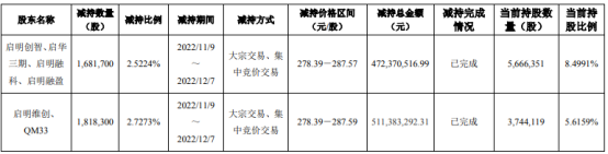 减持前启明维创、QM33合计持有公司股份5,562,419股,合计占公司普通股总股本8.3432%,本次减持后合计持有股份3,744,119股,合计占公司普通股总股本比例为5.6159%。