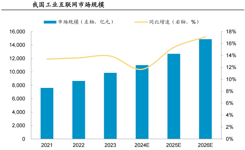 而根据赛迪顾问《2023-2024年中国工业互联网市场研究年度报告》显示,2023年中国工业互联网市场规模总量达到9849.5亿元,同比增长13.9%。预计到2026年,中国工业互联网市场规模达到14862.5亿元,预测增长率为17.13%。其中,工业通信在工业互联网整体产业中占比约为两成,以2023年的工业互联网市场规模为基数,则2023年工业通信的市场规模接近2000亿。