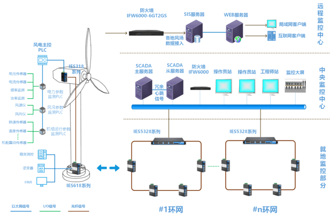 在本地网络架构层面,通过接入IES5328系列全千兆环网交换机,采用SW-Ring环网组网方式,构建起一张稳定可靠的“神经网络”。即当某一节点发生故障时,数据可通过另一方向回传,最大限度降低系统中断风险,确保监控业务持续稳定运行。凭借三旺通信多年在工业互联领域的技术积累,这种冗余机制不仅不会影响传输效率,反而提升了整体网络的可靠性和抗干扰能力,让风电场运维更加省心、安心。