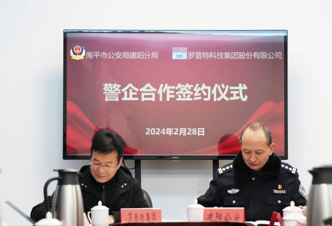 2024年2月28日下午,南平市公安局建阳分局组织召开警企合作联席会,会上,南平市公安局建阳分局与罗普特集团共建的“科技赋警”警企合作工作站签约暨揭牌活动顺利举行。