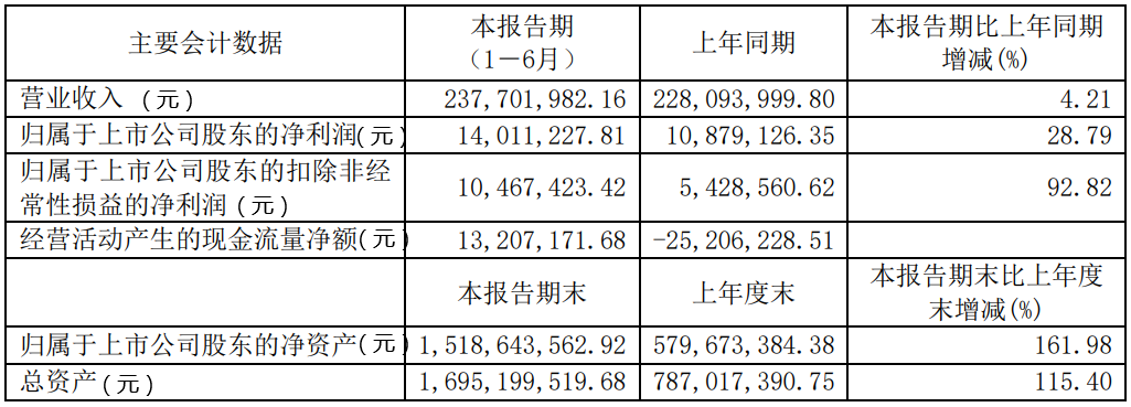 另外,上半年安凯微归属上市公司股东的净资产为15.19亿元,同比增长161.98%;公司总资产为16.95亿元,同比增加115.4%,主要系公司于6月成功登陆科创板,收到募集资金净额为人民币92,495.9万元,增加了资产总额和公司净资产。