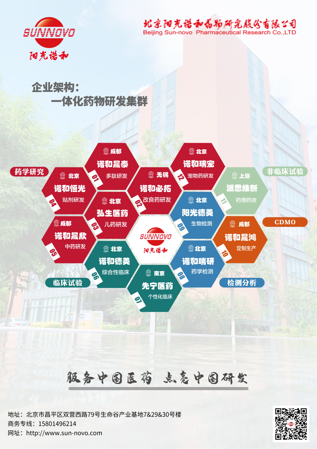 北京阳光诺和药物研究股份有限公司是科创板上市企业(688621),是专注于仿制和创新药物研究,致力于以技术服务为核心,推动中国医药行业发展,为客户提供「临床前+临床+CDMO」全过程药物研发服务的综合型CRO公司。阳光诺和从药物发现、到药理药效、药学研究,再到临床研究资源的整合,生物样本检测团队的构建,生产制造能力的整合,成功打造了全过程CRO服务模式。